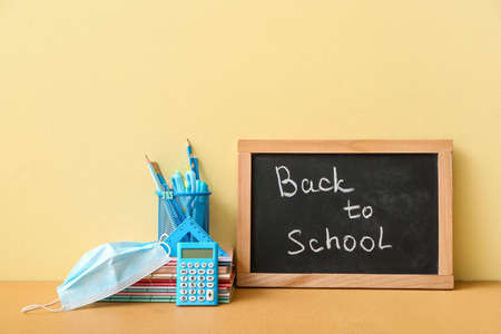 Chalkboard with text BACK TO SCHOOL, set of stationery and medical mask on color background