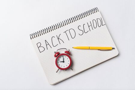 Inscription in copybook BACK TO SCHOOL. Vintage alarm clock and pen. Top view.
