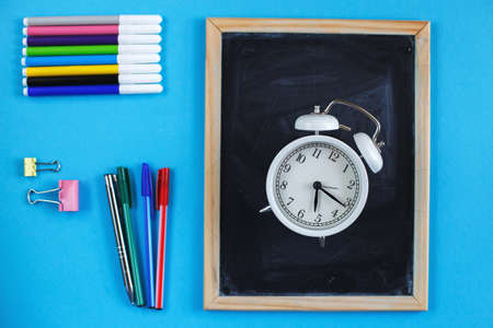 School chalkboard and stationery accessories, pencils, alarm clock and pens. Back to school concept, top view, blue background