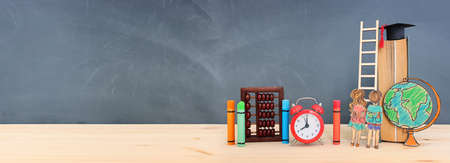 education. Back to school concept over wooden table and blackboard background