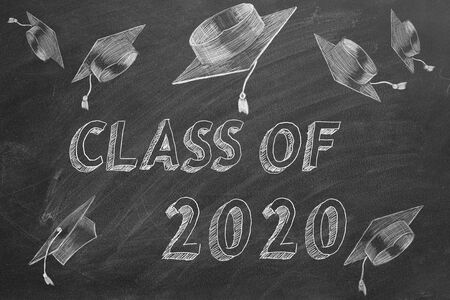 Hand drawing Class of 2020 and graduation caps on blackboard