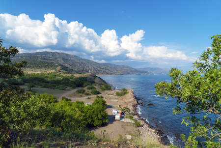 A place for camping on the beach with caravans. Crimea. Choban-kule