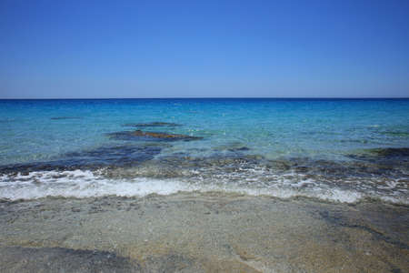 Greece. Aegean sea, Blue clear sky and calm sea. A big rock in the sea