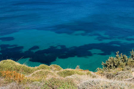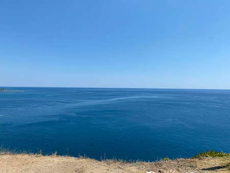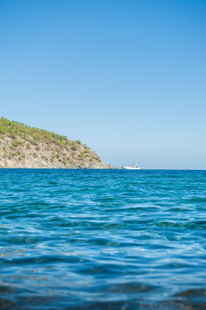 Horizontal view of the turquoise waters of the sea. Wild clifs in front of turquoise water. Summer vacation by the sea