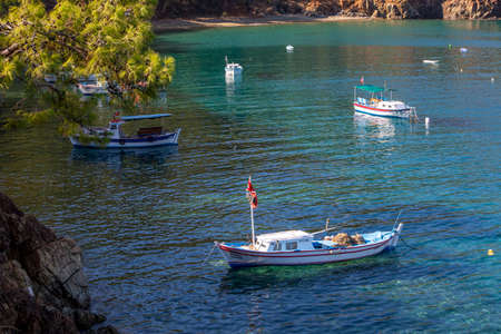 Beautiful bay in Turkey with turquoise water and old fishing boats. Sailing boats in Aegean sea. turkish flags. Morning of fishermen