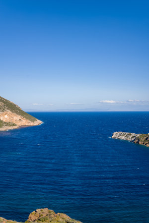 A small islet, cliffs, mountain and bay view in the virgin bays of İzmir Foça. Virgin coves of the Aegean Sea. Phokaia, Izmir Bays.The view of the Karaburun mountains