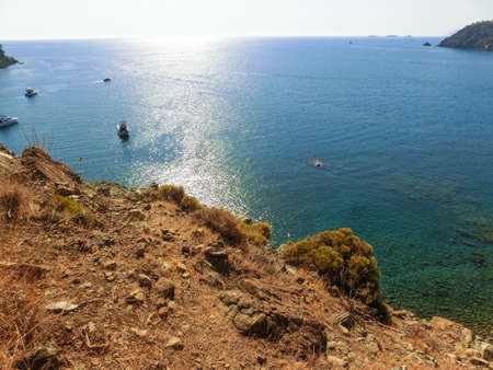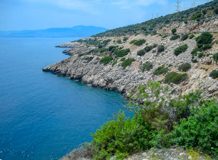 A virgin bay in İzmir Foça. Aegean sea, mountains and natural vegetation of the Aegean covered with maquis. Antique Phokaia in Izmir