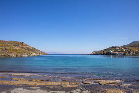 Greece. Kea island. Blue sky, calm turquoise sea water, Otzias bay