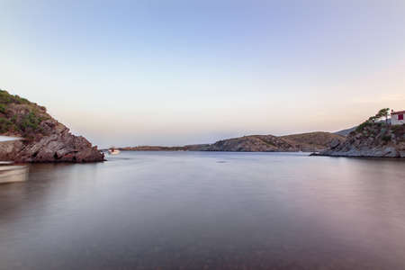 Spain Costa Brava peaceful pebble beach of the Mediterranean sea, Cala Guillola, Cadaques, Cap de Creus, Catalonia.