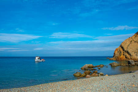 Picturesque view of blue clean sea, rocks, floating boat and green trees. Summer travel concept.