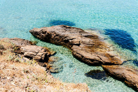 Rocky shore of the Mediterranean Sea in Spain on a beautiful sunny day, calm water