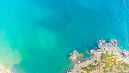 Aerial view from above on calm azure sea and volcanic rocky shores. Small waves on water surface in motion blur. Nature summer ocean sea beach background. Nobody. Holiday, vacation and travel concept