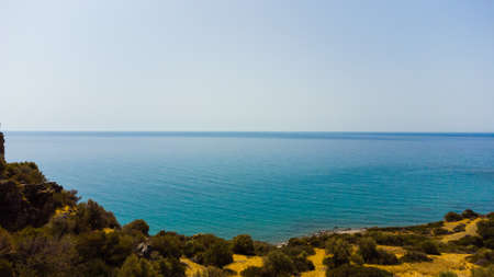 Scenic view over sea water and the rocks at Mediterranean sea coast near Gazipasa, South Turkey on clear day. Typical landscape of South Mediterranean region