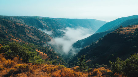 A deep valley covered in low-hanging fog, with mountain slopes gradually fading into the distance.