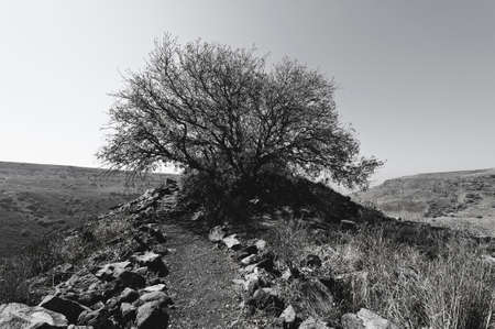 Gamla nature reserve located in the Golan Heights in Israel. View of the archaeological sites. Black and white photo