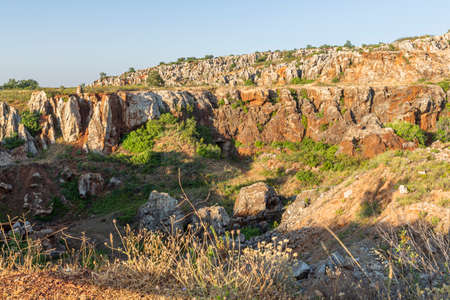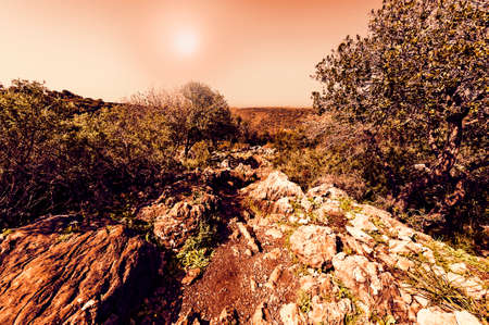The nature of the western Galilee in Israel with forests, rocks, gorges and olive groves at sunset