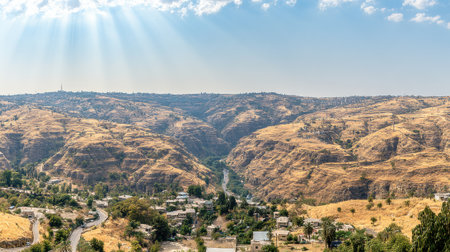 A scenic panoramic view of a sun-drenched valley with a small community nestled among arid, golden hills under a bright blue sky with dramatic sunbeams.