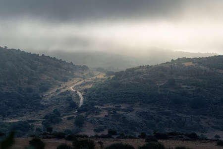 Winter landscape, fog and dark clouds, road to the top of the mountain, green plants and dark mysterious atmosphere. Spain.