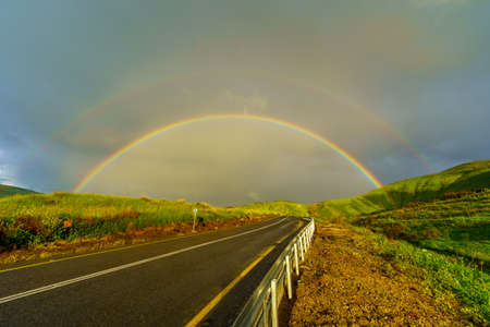 View of a double rainbow, on the slopes of the Golan Heights, with a trilingual mine warning sign, on a foggy winter day. Northern Israel