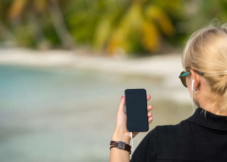 Woman hand showing a blank smart phone on the beach with the sea in the background