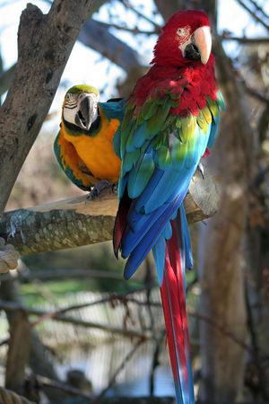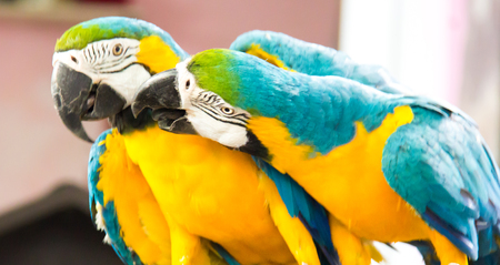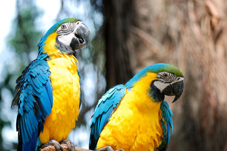 close up of two beautiful blue and yellow macaws (Ara ararauna)