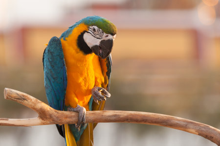Close up of blue and yellow Macaw parrot or Ara ararauna is native to Mexico and South America.