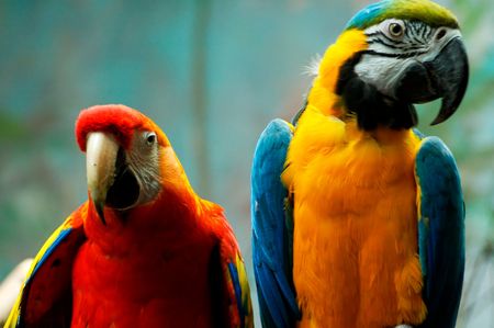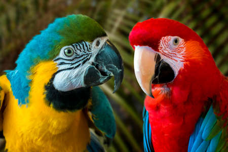 Blue - Gold Macaw and Scarlet Macaw parrot on naatural green background.