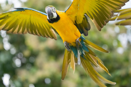 Beautiful Blue and gold macaw parrot flying on green nature background.