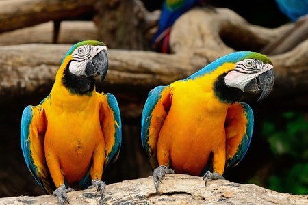Two blue yellow parrots macaw on branch of old tree. Ara ararauna, Macaw parrot