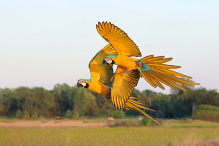 Colorful Blue and Gold Macaw parrots flying on the rice fields. Free flying bird