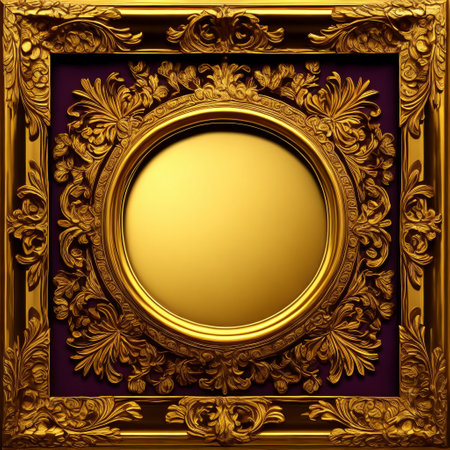 An empty, ornate golden picture frame is positioned at an angle on a dark, textured surface. The frame has a detailed, carved design and a warm golden hue. The background is a deep, muted color, making the frame the central focus of the image.