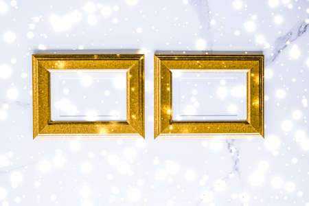 Art gallery, printable poster and online shop mockup concept - Golden photo frame and glowing glitter snow on marble flatlay background for Christmas and winter holidays