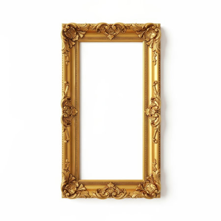 Ornate gold vintage photo frame, isolated on a smooth gray background, highlighting its intricate craftsmanship and regal design