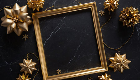 Golden christmas decoration on black marble background. Flat lay, top view