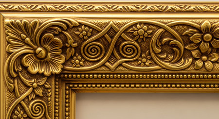 An extreme close-up of the corner of an ornate, antique picture frame with a gold leaf finish. The intricate, hand-carved details feature floral and scrollwork patterns, representing luxury, classic design, and craftsmanship.
