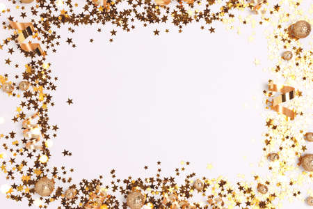 Border frame made of gold colored confetti on a white background.