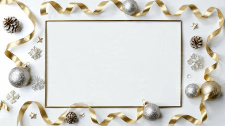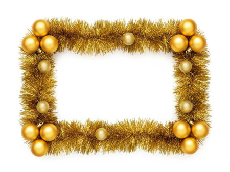 This image features a decorative golden Christmas frame adorned with tinsel and baubles, set against a clean white background. The frame is rectangular and decorated with golden ornaments, creating a festive and elegant holiday decoration.