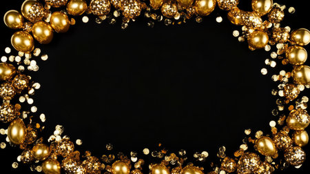 Golden balloon frame with shiny confetti on black background generative ai
