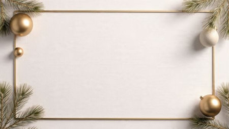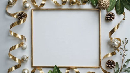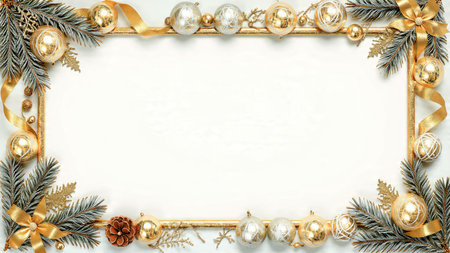 Bright and balanced Christmas frame featuring deep green foliage and glittering decorations.