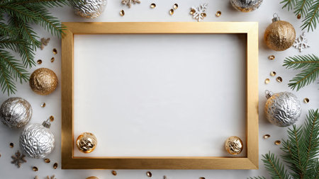Winter holiday layout with pine needles and delicate shiny decorations forming a frame.