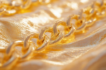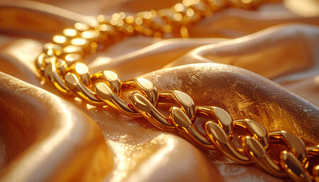 A close-up view of a shiny golden chain resting on a soft satin fabric, showcasing its smooth texture and elegance ideal for jewelry promotions.