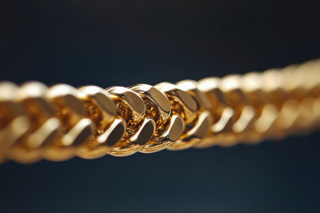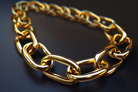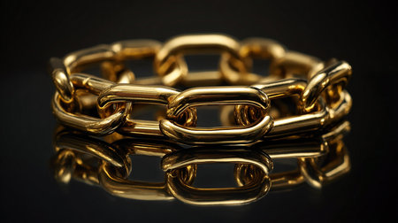 Closeup image of a luxurious golden chain with a reflective surface on a sleek black backdrop