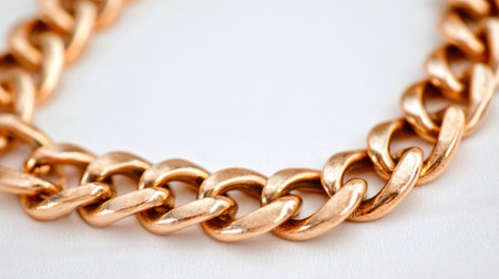 This close-up image showcases a beautiful golden chain link jewelry piece elegantly arranged on soft white fabric. The intricate details and shimmering texture highlight the craftsmanship and luxury of the design.