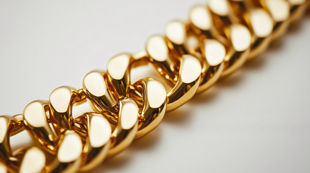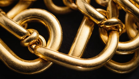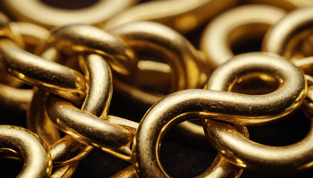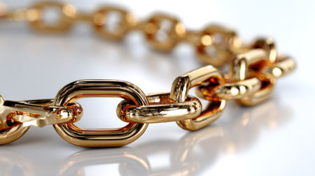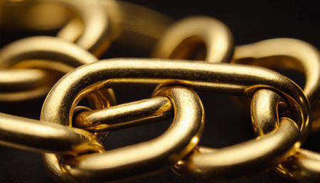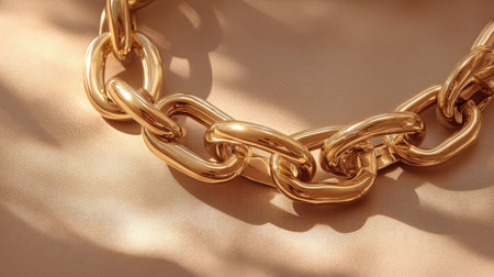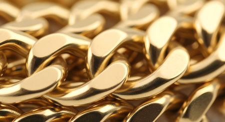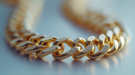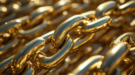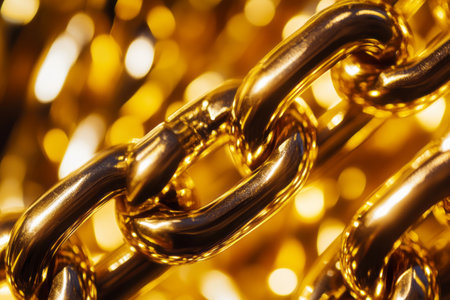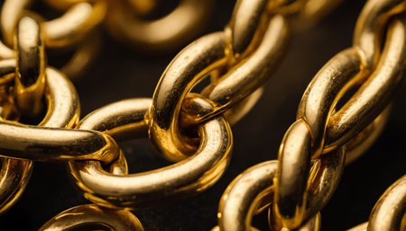 A detailed close-up view of shiny golden chain links gleaming in natural light. The soft background enhances the metallic texture, symbolizing strength and luxury.