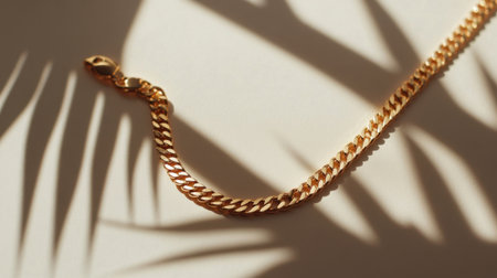 This stunning image features an elegant gold chain jewelry piece casting beautiful shadows. The soft background highlights the exquisite texture and craftsmanship, perfect for fashion-themed content.