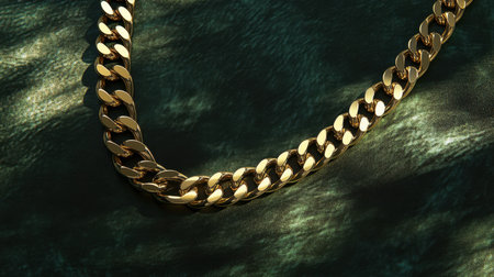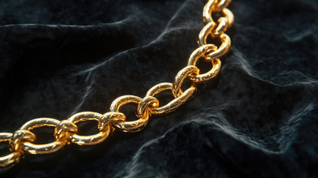 A luxurious close-up of a shiny gold chain resting elegantly on a black velvet background, showcasing its exquisite details and opulent design ideal for fashion or jewelry use.