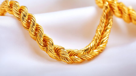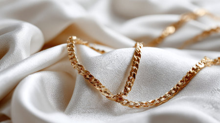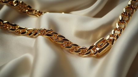 A stunning gold chain rests gently on a soft silk fabric, offering an elegant display of luxury and craftsmanship. Ideal for fashion or jewelry projects.