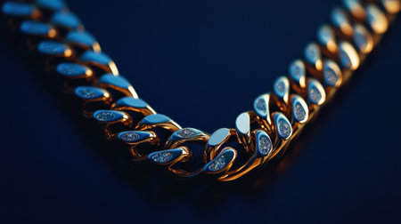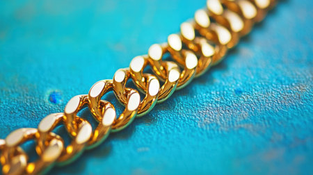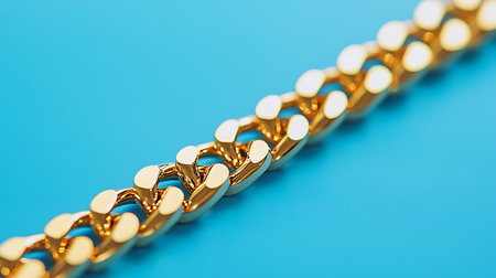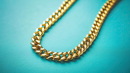 This stylish image highlights a lustrous gold chain, accentuating its metallic elegance and bold design against a clean, vibrant blue background. The composition exudes upscale sophistication.