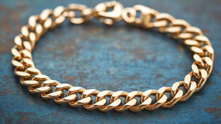 This elegant gold chain bracelet displays stunning shine and intricate design on a textured surface. Ideal for fashion, jewelry, and accessory photography.