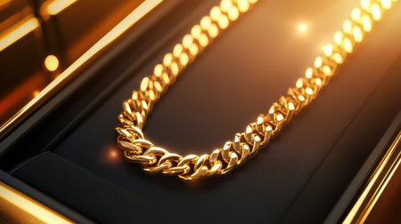 A stunning closeup of a gold chain necklace displayed on a sleek black background, radiating elegance with warm glows and sparkling highlights, perfect for fashion enthusiasts.